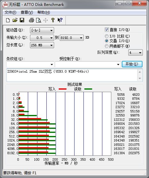 ATTO Disk Benchmark峰值测试USB3.0速度:写入速度160MB/S ,读取速度202MB/S,速度跟电脑配置/操作系统有关,并不保证你的电脑能达到此速度。